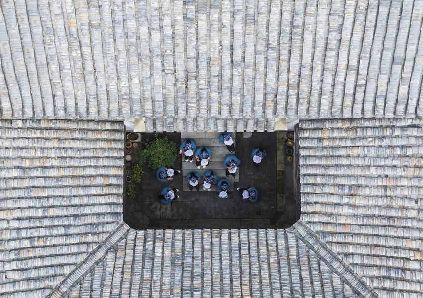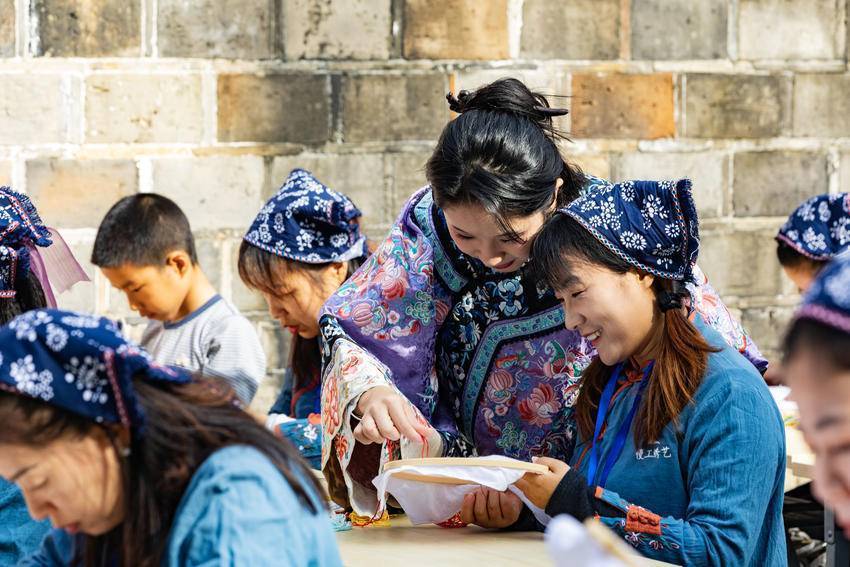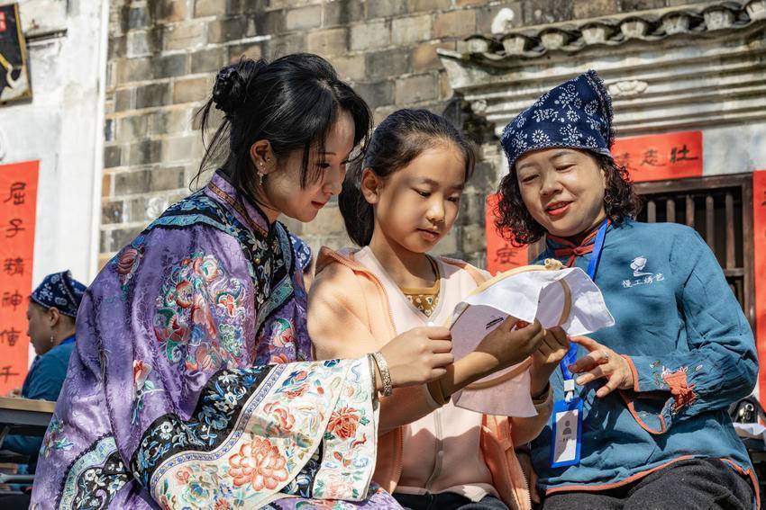 2025年11月2日,在秭归县屈原故里文化旅游区芈绣馆内,绣娘们正在指导小朋友学习刺绣技法。彭强摄