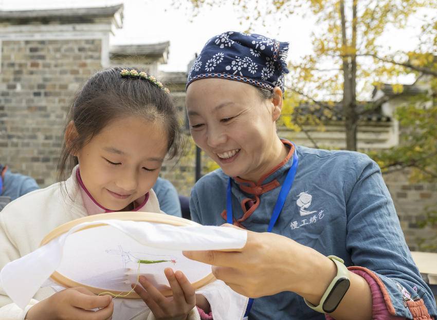 11月2日,一位绣娘在秭归县屈原故里文化旅游区芈绣馆指导小姑娘进行刺绣。郑家裕摄