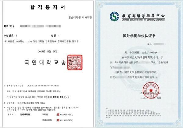国民大学录取通知书及中留服国外学历学位认证书样本