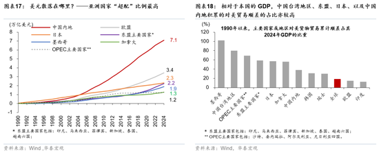 亚洲经济体在全球美元资产“超配”幅度最大。1990年来,对美累积货物贸易顺差最多的国家和地区分别是中国(7.1万亿美元)、欧盟(3.4万亿美元)、日本(2.3万亿美元)、东盟(2.2万亿美元),而相对于本国的GDP,囤积美元最多的国家和地区可能是墨西哥、中国台湾地区、OPEC、东盟、日本,其中亚洲经济体“超配”美元的绝对与相对规模均较高(图表17和18)。如果美元趋势性贬值,亚洲经济体纠正本外币错配、减少美元的“超配”势在必行,其潜在的资金回流体量不可低估。