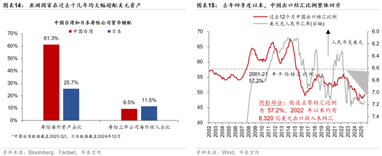 目前人民币估值仍大幅低于均衡值,且人民币资产(即使在国内主体而言也是)实质意义上是被大幅低配的,在全球去美元化的背景下、人民币有较大的升值空间。近年来,中国出口占全球的比例持续上升,贸易顺差和经常项目顺差占比也节节攀升,显示人民币估值可能低于均衡值(图表13)。另一方面,美元作为全球储备货币,在全球化加速时代享有较高的估值溢价和超额配置。过去20-30年间,全球主要制造业大国积累了较大规模的对美货物贸易顺差,因此长期“超配”美元。以亚洲为例,日本、中国台湾地区金融机构的美元资产占比明显高于美元负债,资产负债表货币错配的现象较为突出(图表14)。而在中国,金融机构之外,出口商也在2012年后大幅超额“配置”美元资产,体现为出口商的结汇比例大幅下降(图表15)。全球去美元化大幕初启,或将为亚洲和人民币资产回流/升值提供持续动力。