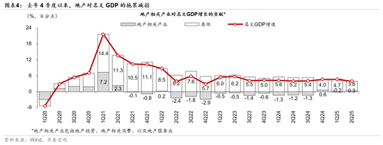 此前地产去杠杆对名义增长和私有部门预期的拖累明显下降。2021年下半年以来,本轮中国地产成交量的累计调整幅度已接近海外国家类似周期的区间上限,目前地产周期可能已进入磨底阶段。当地产调整进入下半段,名义GDP增速企稳,地产成交额磨底、房价下行势能减弱时,居民预防式储蓄不再上升,消费倾向有望企稳,此前延迟和压抑的可选消费需求或有所释放(参见《中国地产:分化中的积极信号及其宏观涵义》,2025/3/24,以及《论地产调整下半场消费修复的潜力》,2025/3/25)。同时,地产调整后相关产业链占GDP的比重下降,叠加地产相关指标降幅收窄,地产周期对名义GDP的拖累有望收窄(图表4)。