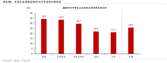 人民币兑美元升值可能继续“撬动”全球去美元化,尤其对亚洲国家而言。中国占亚洲国家对外贸易的比例较高,如2024年对华贸易分别占日本、东盟对外贸易的21%、26%(图表16)。当人民币兑美元汇率保持稳定时,将降低中国贸易伙伴、尤其是亚洲国家使用对冲美元波动率的需求。如果未来人民币兑美元升值,或将推升亚洲国家使用人民币结算的需求、以及对冲美元波动率的需求。
