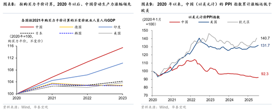 周期企稳令国内生产力提升更显性化。近年来,中国生产力提升快于全球其他主要经济体,而此前“弱需求”对价格的压制很大幅度上掩盖了生产力持续、快速提升下的成本优化。从购买力平价衡量的单位劳动力GDP来看,2018-2023年中国累计增长了约28%,明显高于全球/OECD平均的7%/4%,2020年以来增幅亦达到13%(图表8)。同时,DeepSeek等高科技企业点燃投资中国“工业化4.0”的热情,新兴产业投资,尤其是以私有部门主导的,包括软硬件、基础设施等在内的AI+投资有望进入“井喷”阶段,有望进一步提升生产效率。