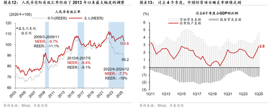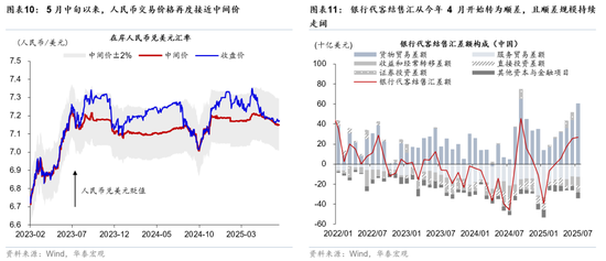 近日人民币兑美元和一篮子货币加速升值。8月28-29两个交易日,离岸人民币兑美元升值0.4%。一方面,每日美元兑人民币中间价近来有所上调,但另一方面,市场力量也开始加速推动人民币走强——近日在岸人民币交易价格接近中间价、而离岸人民币汇率强于在岸即是例证(图表10)。近期,全球对配置中国权益资产的偏好上升可能是近期人民币汇率走强的催化剂之一(参见华泰策略组报告《外资对中国资产关注度升温》,2025/8/24)。然而,我们认为,人民币兑美元升值“蓄势”已久,有进一步走强的空间,且可能成为驱动美元名义有效汇率(NEER)下一轮贬值的最大权重货币。往前看,人民币汇率有较强的基本面支撑,仍有进一步升值动力,我们重申12个月美元兑人民币汇率6.98的预测(参见《人民币或将有升值动力》,2025/5/22,以及《中国2025年下半年宏观展望:“再平衡”中孕育新机遇》,2025/6/3)。