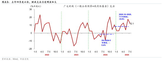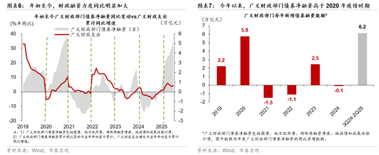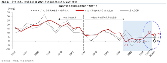 财政政策5年来第一次实现持续扩张。由于地产相关产业链占GDP的比例较高,地产周期走势在很多程度上决定内需走势(图表4)。2021年下半年以来,地产调整明显拖累名义GDP走势,亟需财政政策发力加以对冲。然而,由于地产周期偏弱导致地产相关税收收入和土地出让收入承压,即便广义财政赤字率走阔,2021-2024年广义财政支出增速持续低于名义GDP(图表5)。今年两会预算的政府债新增额度同比多增2.5万亿元财牛股配,且年初至今财政融资和支出明显前置,带动(中央+地方)广义财政支出增速在2021年以来首次超过名义GDP、达到9.3%,超过2021-24年的-1.2%、3.3%、1.3%和2.7%,实现真正意义上的财政扩张(图表6和7)。
